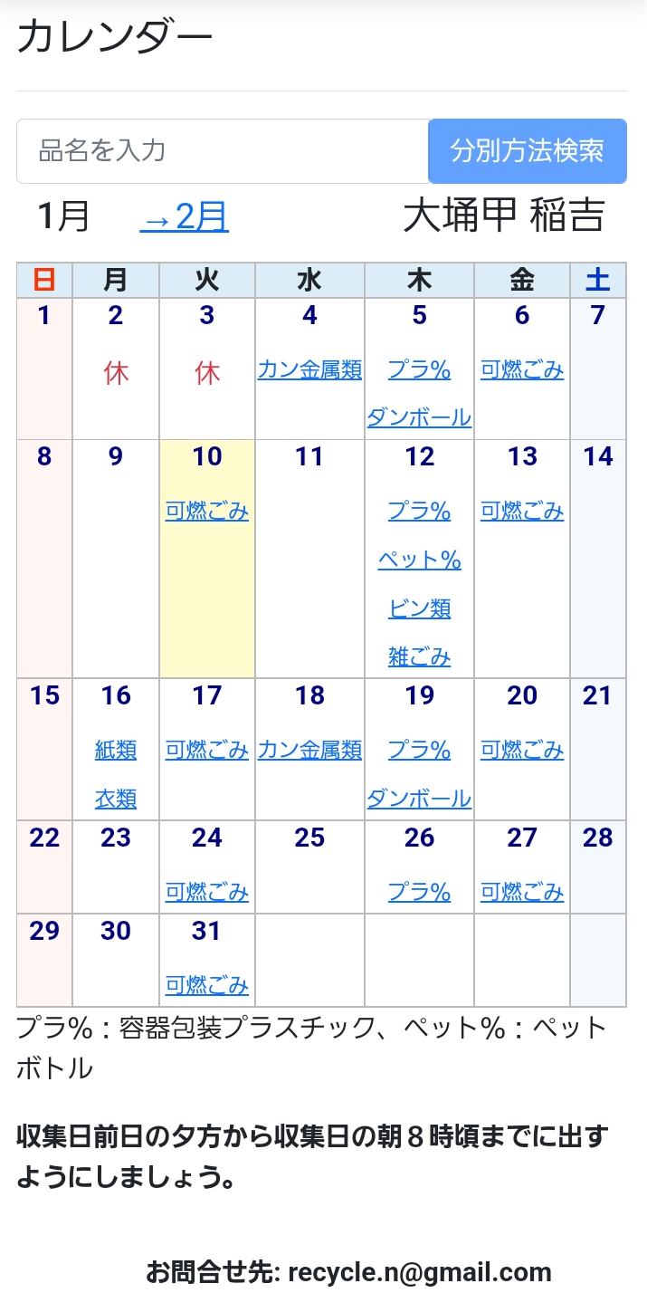 収集日のゴミ名をクリックすると、ゴミの出し方を表示します。