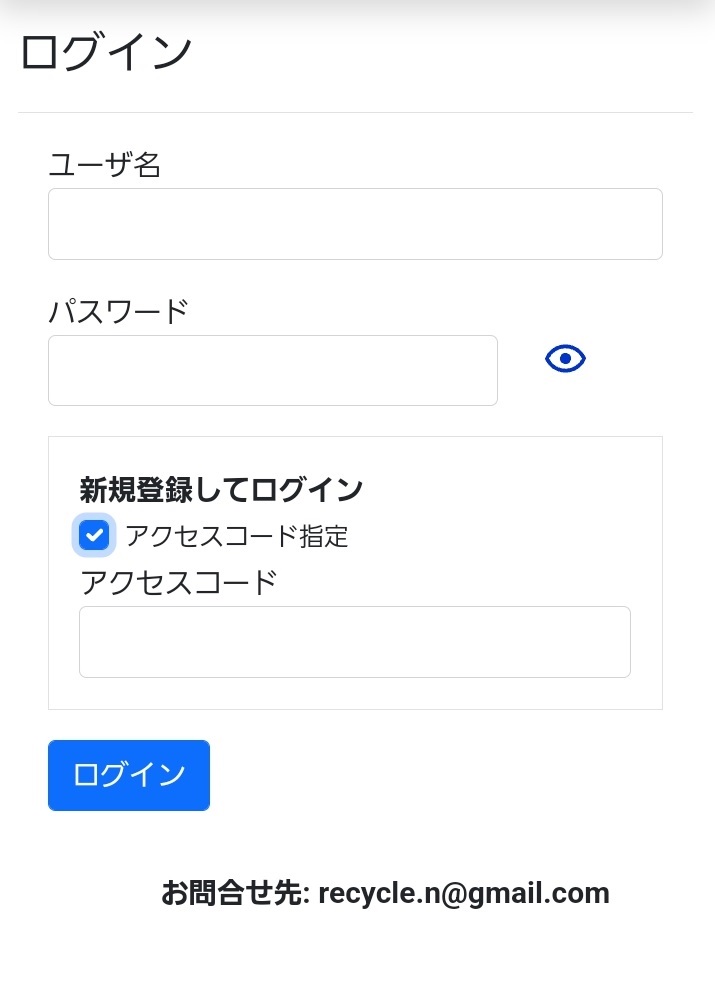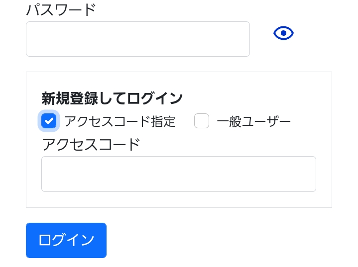 新規にユーザ登録したい時は、新しい「ユーザ名」、「パスワード」を入力し、「アクセスコード指定」をチェックして ログインしてください。指定のユーザ名、パスワードが登録された状態になります。